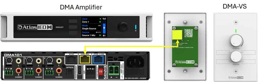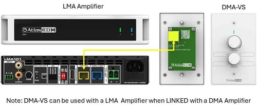 In single-zone applications, the DMA-VS provides full control of source selection and volume for Zone 1. In two-zone systems, each zone can be equipped with its own DMA-VS, delivering fully independent control when a DMA amplifier is paired with an LMA amplifier. The DMA-VS is a low-voltage device that installs into standard single-gang electrical boxes, making it compatible with most commercial AV and low-voltage infrastructure.