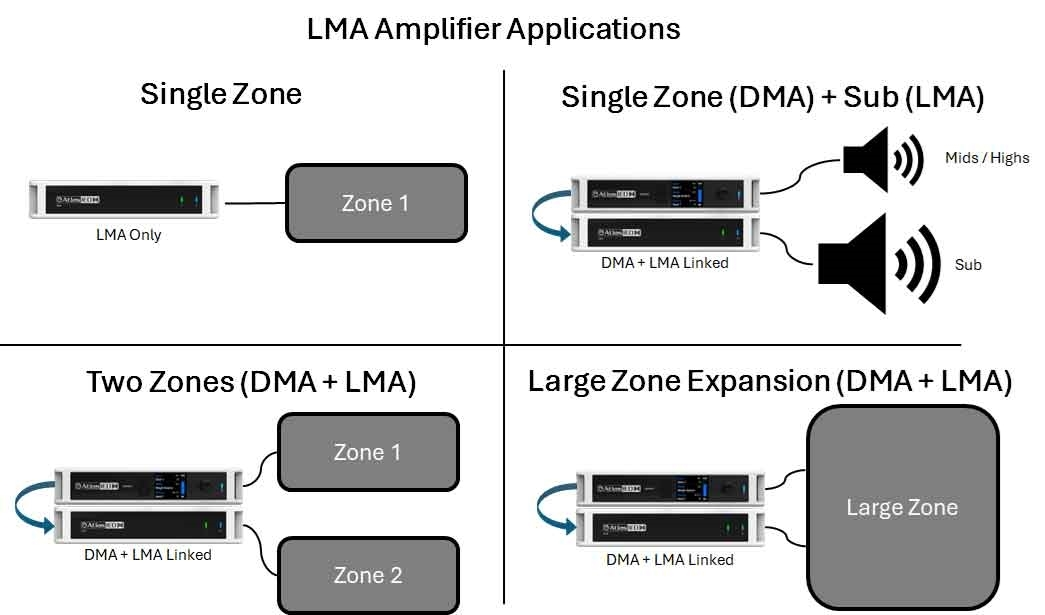 The AtlasIED LMA101 is a 100W single-channel, multi-impedance power amplifier designed to serve either as a standalone zone amplifier or as an expansion amplifier when paired with an AtlasIED DMA Series mixer amplifier. Its straightforward architecture and integrator-friendly controls make it well suited for small commercial spaces, auxiliary zones, or applications requiring dedicated amplification without added system complexity.